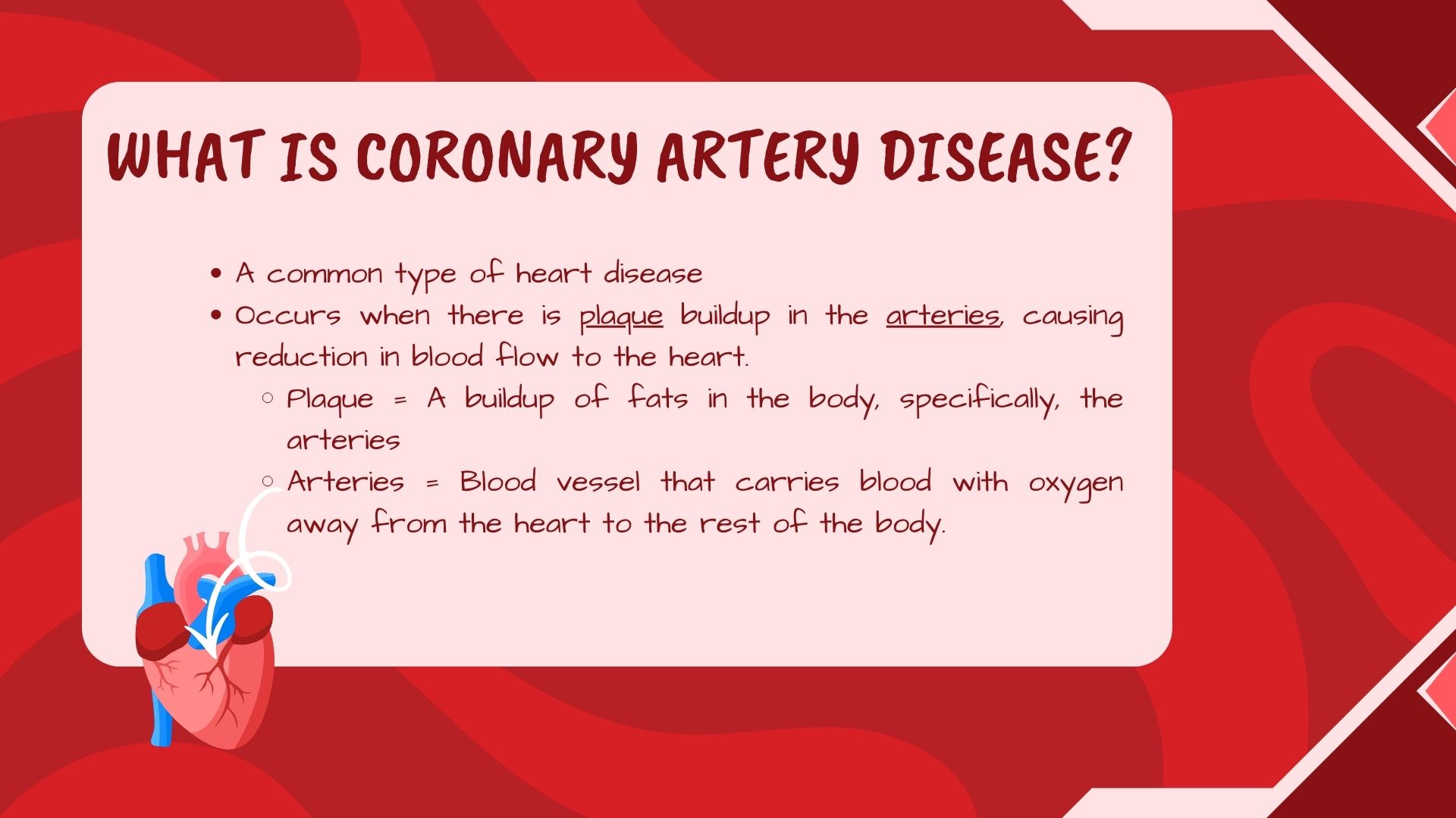 plaque narrows artery → less blood to heart → chest pain → possible heart attack.