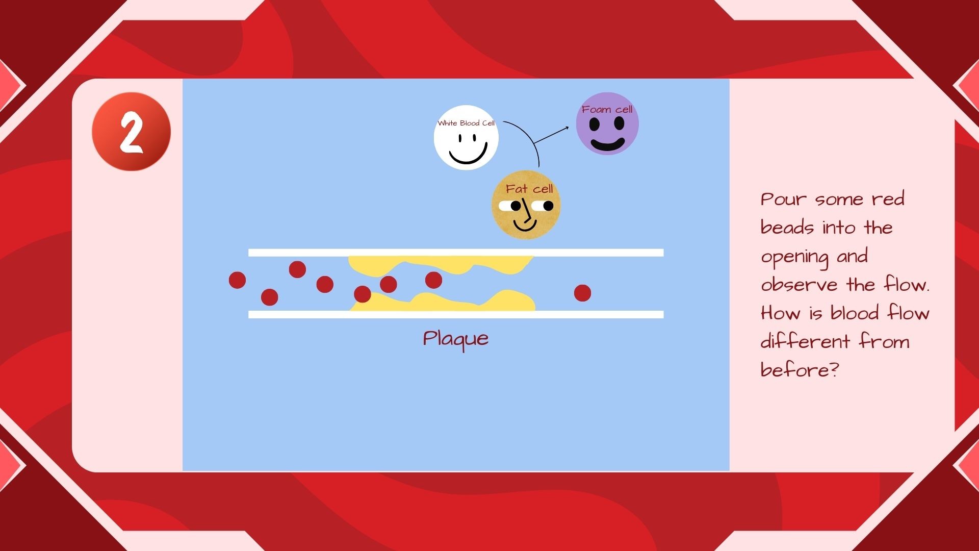 Students explored the development of coronary artery disease by modeling how cholesterol and plaque affect blood flow in arteries. Using clear tubing, beads, play dough, and other materials, they constructed step-by-step artery models to visualize endothelium damage, LDL accumulation, foam cell formation, plaque growth, and fibrous cap development.