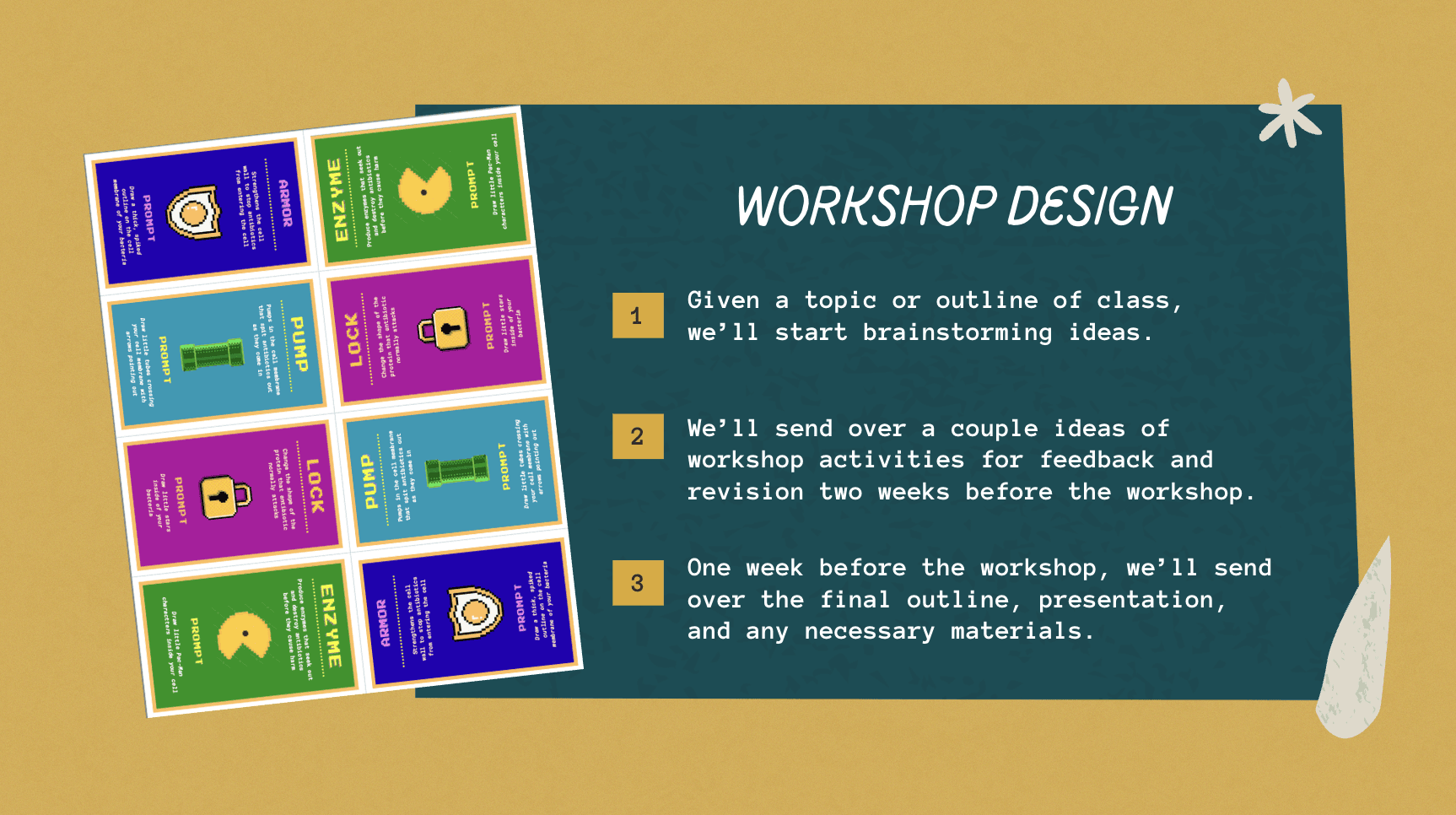 Our workshops are created entirely by our team of student volunteers, especially our workshop designers. Below is an overview of our full workshop development process.