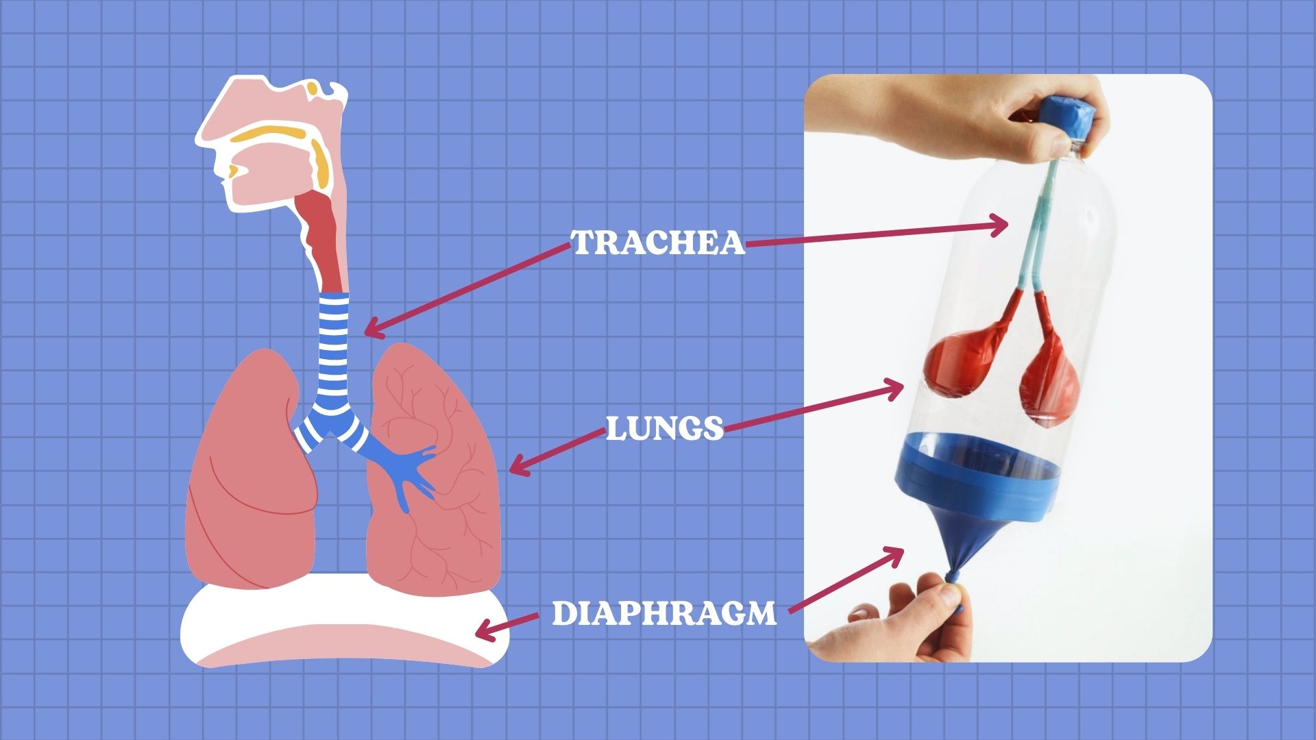 Each student makes their own lung model using a plastic bottle, balloon (lung), and balloon (diaphragm)
